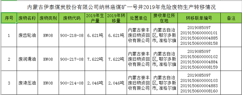 米兰体育官方网站煤炭股份有限公司纳林庙煤矿一号井2019年危险废物生产转移情况